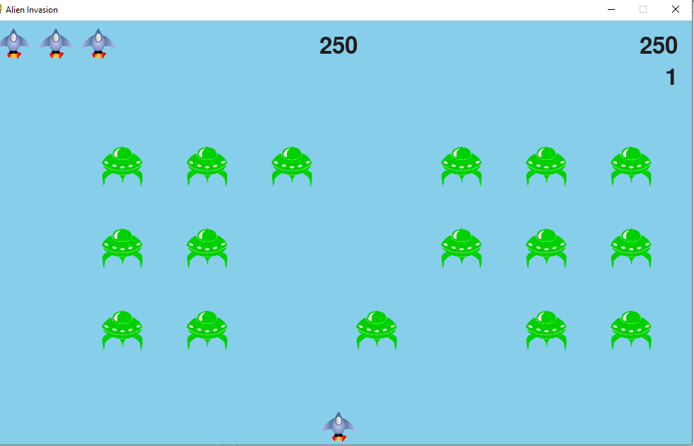 A game I modified using the Python Crash course book With the help of the Python Crash Handbook, I was able to create an alien invasion game using pygame. I modified the code by refactoring and being able to save the highscore.